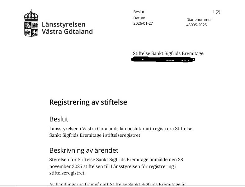 GOOD NEWS! The St. Sigfrid's Hermitage Foundation has now finally been approved and registered by the Västra Götaland County Administrative Board. "Stiftelse Sankt Sigfrids Eremitage" is now listed in the county's register. This is important in order to: